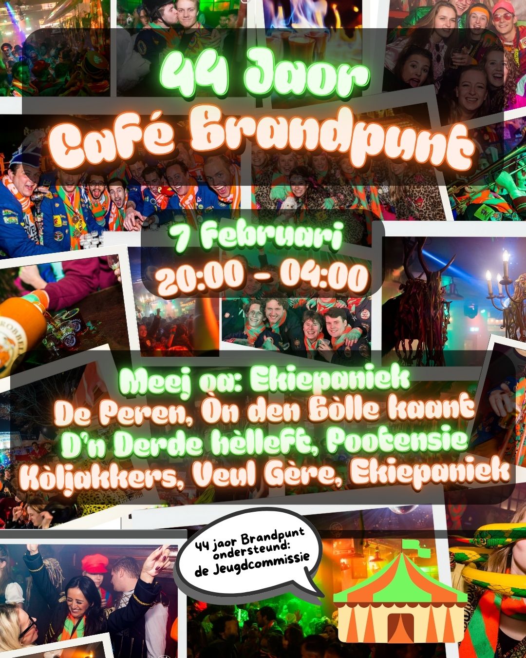 4×11 Jaor Café Brandpunt. Dat vraagt om een feestje samen met residerende CV’s en alle kruiken en kruikinnen. Een avond vol vermaak en diverse gastoptredens. van oa: Veul Gère, de Kòljakkers en Ekiepaniek. 20:00 tot 01:00 in de tent, 01:00 tot 04:00 in Café Brandpunt